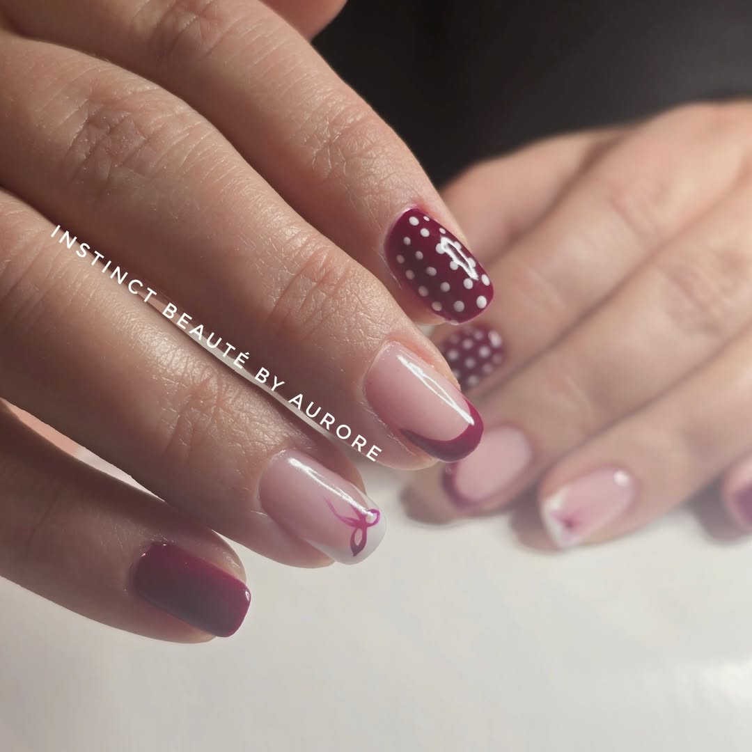 J’adore ce mélange : un French bordeaux revisité, des ongles unis pour la profondeur, et un petit clin d’œil rétro avec des pois sur l’annulaire et le majeur ! 🎀