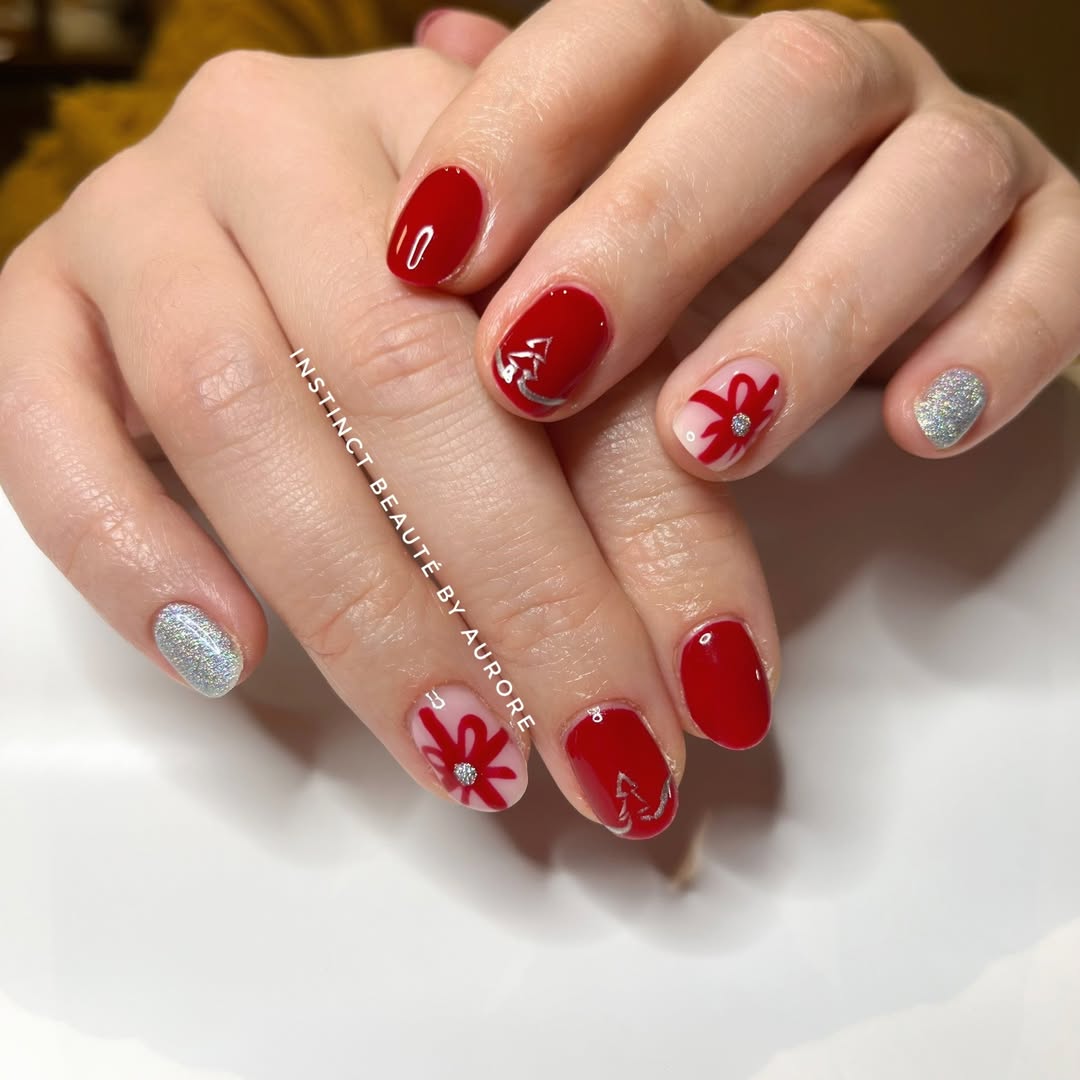 Cette pose de semi-permanent combine la douceur du rose nude et l’élégance du French blanc, avec l’éclat des paillettes pour la touche festive. L’équilibre parfait !