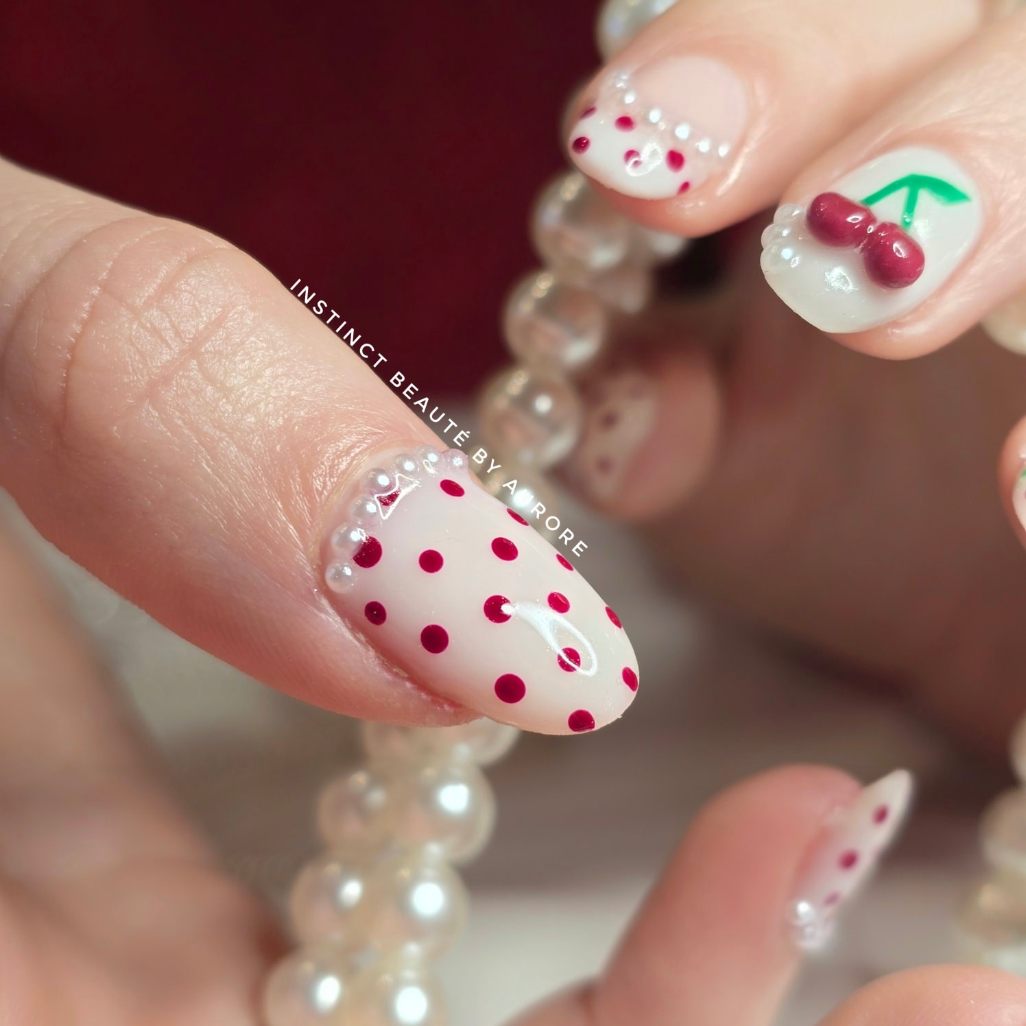 Zoom sur ce nail art fruité où la cerise se porte en relief ! On adore le contraste entre la base laiteuse, les petits pois rouges et ces détails perlés qui viennent souligner l’ongle.