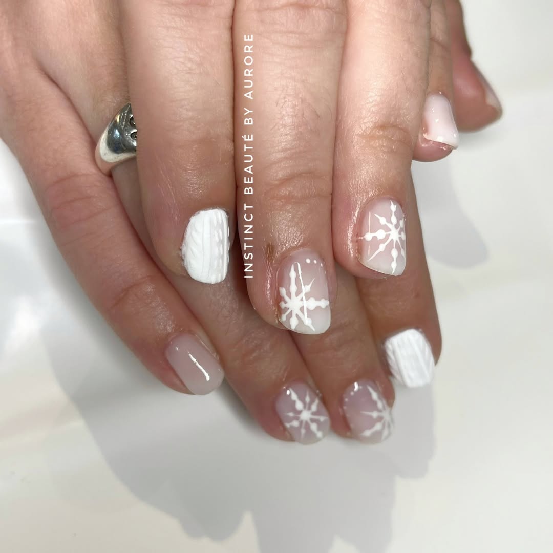 #InstinctBeaute #NailArtHiver #SweaterNails #FloconNails #WhiteManicure #JadeCreation #OnglesRelief #CocooningStyle #ManucureParfaite