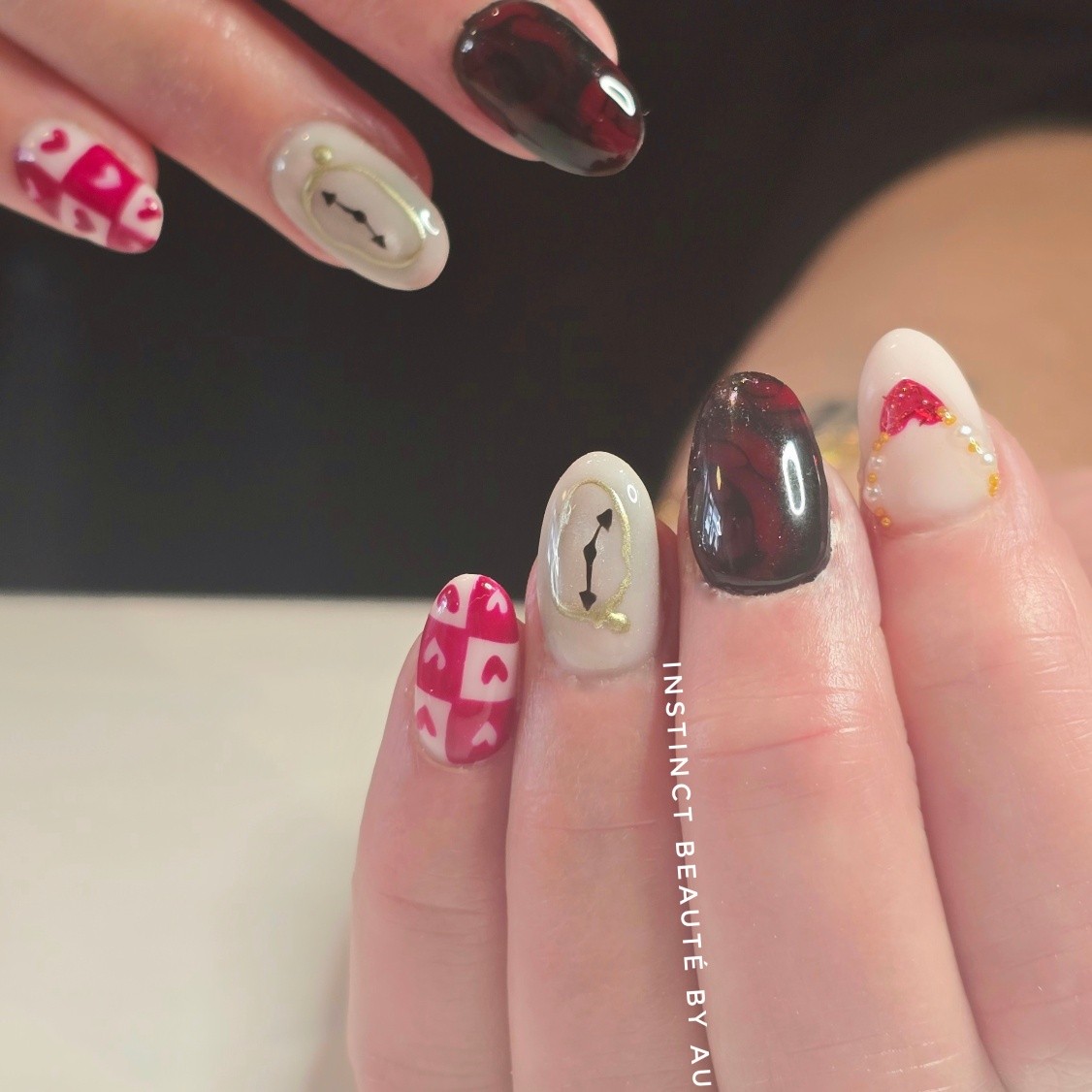Zoom sur ce nail art 100% Alice au Pays des Merveilles ! On craque pour le détail de la montre à gousset et le damier « Queen of Hearts ». ❤️👑